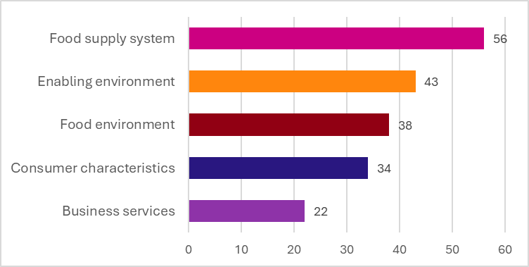 Open allClose allIn terms of food system activities; all policies identified targeted the food supply system (encompassing agricultural production/fisheries, storage, transport, processing, retail and consumption), with 43 policies targeting the enabling environment in which the food supply system operates (including institutions and infrastructure, see Figure 1). The food environment is targeted by 38 policies, consumer characteristics by 34 policies, and 22 policies target the business services related to food systems.